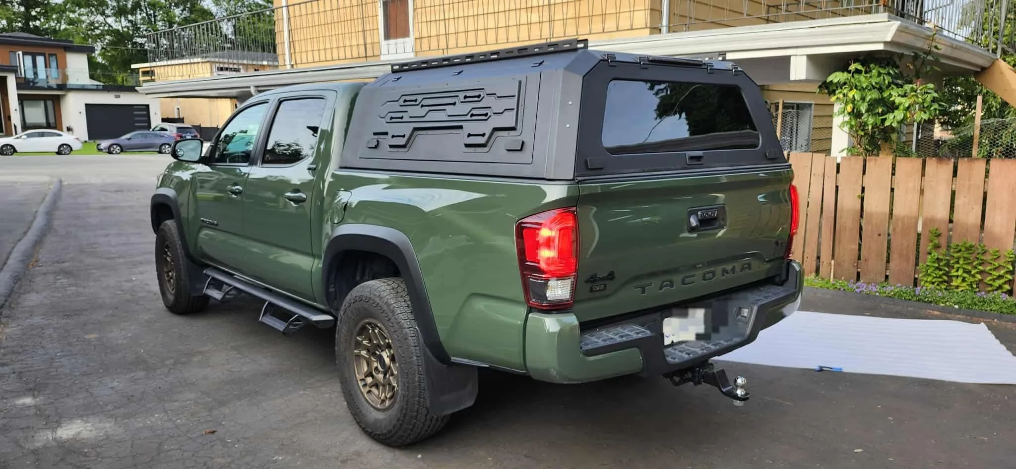 Height: Flush with truck cab (+3 inches for roof rack and cross bars).